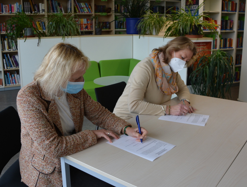 Mit der Leiterin der Kinder- und Jugendbibliothek, Katja Blume, wurden für die Schule passende Kooperationsformen vereinbart. Hierzu gehören Klassenführungen in der Stadtbibliothek, Einführungen in die Programmiersprache „Scratch“ für Kinder und Jugendliche sowie die Vermittlung von Methoden zur Informationsrecherche.