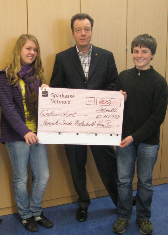 Hanno Baumann, der Präsident des Lions Club überreichte den Scheck an Juliane Losing und Sören Walter aus der 8a, die mit ihrem Fensterbild punkten konnten. Den ersten Platz belegte die freie evangelische Hauptschule, den zweiten Platz das Stadtgymnasium. Herzlichen Glückwunsch.