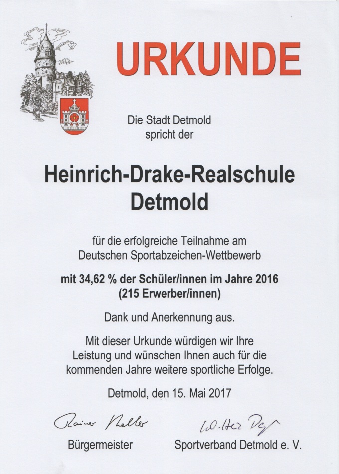 Eine weitere Urkunde für diesen Sportabzeichen-Wettbewerb erhielt die HDR im Mai 2017 von der Stadt Detmold.