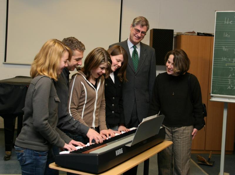 Werner Jost (2. v. l) und die Schülerinnen Kristin von Gescher (l.), Lisanne Zelber (3. v. l) und Svenja Tölle (Klasse 7b) führen Jürgen Wannhoff und Christiane Roth das neue Keyboard vor.