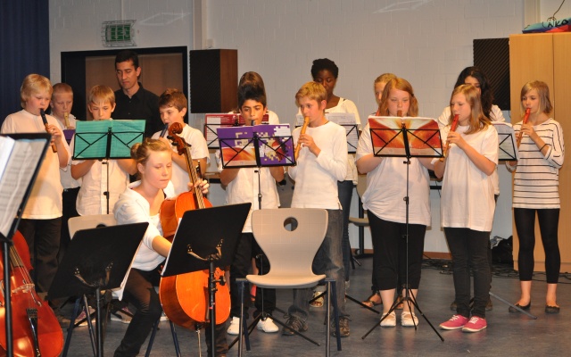 Den Reigen eröffnete die Musikklasse 5b, die nach einem knappen Jahr Unterricht auf Streichinstrumenten ihr bereits beeindruckendes Können mit vier kurzen Stücken unter Beweis stellte. Auch die Schülerinnen und Schüler der Klasse, die nicht auf Streichinstrumenten unterrichtet werden, bereicherten die Vorträge durch ihre Flötenkenntnisse.