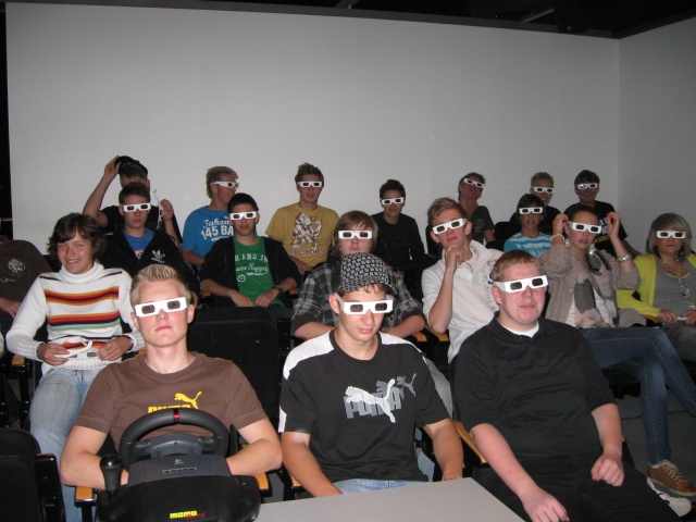 Zuerst konnten die Schüler eine 3D-Vorführung zum Thema KFZ-Scheinwerfer-Entwicklung verfolgen und anschließend in einer Fahrsimulation alles selbst ausprobieren.