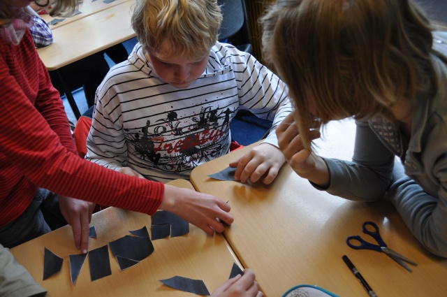 Die Teams der 6b grübeln, wie sie aus diesen Figuren ein Quadrat legen können.