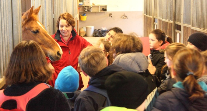 Jens Gerdelmann hatte seine Schülerinnen und Schüler hervorragend vorbereitet, denn sie bestürmten Anja Graeve-Kamp mit Fragen. Die Frage danach, was ein Pferd denn so kostet, brannte vor allem den Schülerinnen auf dem Herzen. Anja Graeve-Kamps Antwort, dass die Anschaffung gar nicht das Teuerste sei, sondern man monatliche Kosten von mehreren Hundert Euro für Unterbringung, Futter, Schmied, Tierarzt, Versicherung, Ausrüstung, Pflegemittel und dergleichen habe, sorgte für erschrockene Gesichter.