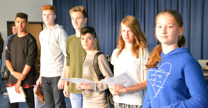 Karim Siemann (9b), Mischa Heidebrecht (9d), Timo Landwehr (9d), Rohan Sansar (5d), Celine (6c) und Celine (5b).
