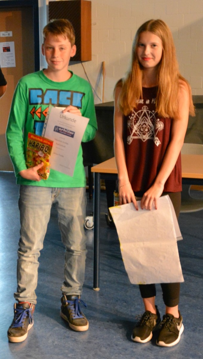 Jarno Focke (6b) und Angelina Bevs (6a) werden für ihre erfolgreiche Teilnahme am Kunstwettbewerb