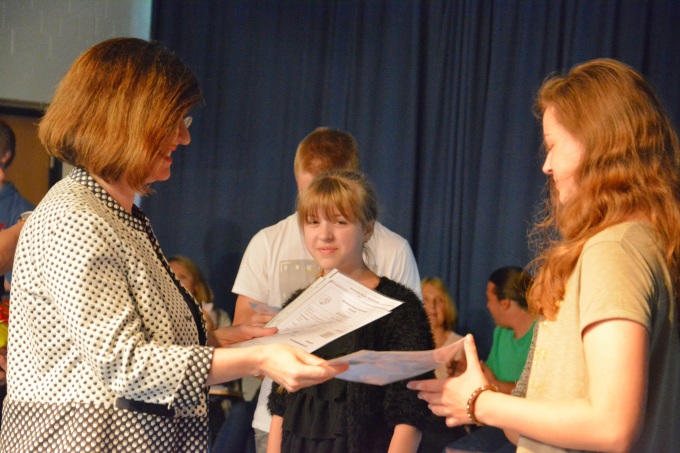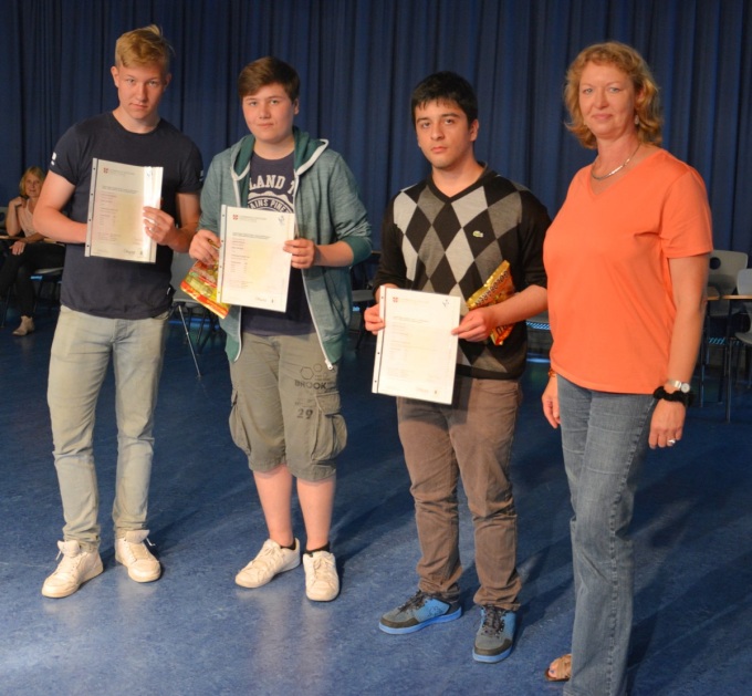 Konrektorin und Kursleiterin Bianka Gehler ehrt die erfolgreichsten Teilnehmer des Cambridge-Zertifikats: