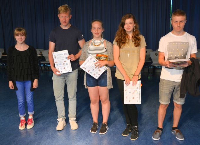 Geehrt wurden Michelle Gramlich (Stufe 5), Celina Schombierski, (Stufe 6), Pia Landl (Stufe 7), Daniel Gramlich (Stufe 8) und Leon Frickemeier (Stufe 9).
