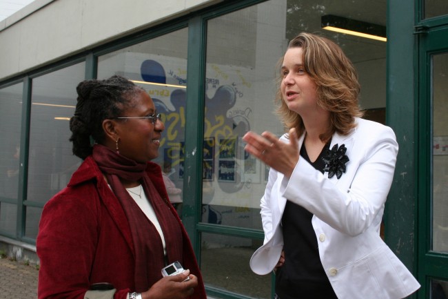 (v. l.) Sammy Holloway aus Atlanta und Englischlehrerin Anja Graeve-Kamp beim Rundgang durch die Schule.