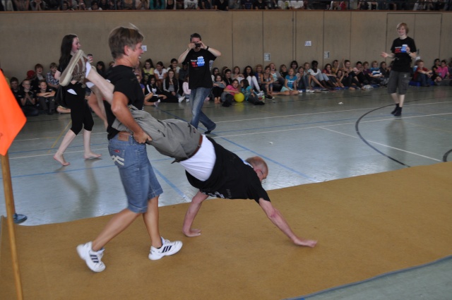 Die Schüler hatten sich bereits zuvor mit Mottotagen und einem gelungenen "Halli-Galli-Tag" von ihrer Schule verabschiedet. Dabei mussten sich die Lehrer einmal richtig ins Zeug legen: als Models auf dem Laufsteg, beim Bockspringen und Mattenrutschen präsentierten sie vor der versammelten Schülerschaft ganz spezielle Talente.