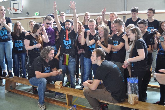 Die Klassenlehrer der 10. Klassen hatten sich für diesen Abend etwas Besonderes ausgedacht. Statt ihre Klassen durch einzelne Reden zu würdigen, spielten die Lehrer den Schulalltag der letzten zwei Jahre nach und schlüpften dabei in die Rollen der Schüler.