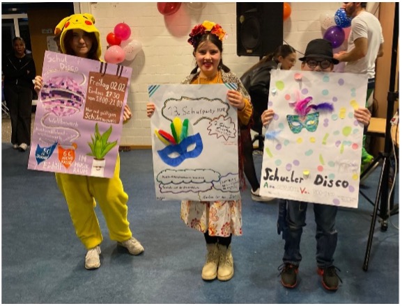 Am Freitag, den 02.02.2024 wurde bei uns die diesjährige Karnevalsparty veranstaltet, ca. 3 Wochen vorher konnten die Tickets bei den Veranstaltern höchstpersönlich – der SV – erworben werden und wer sich spontan entschied, doch noch vorbeizuschauen, konnte auch noch am Abend der Party ein Ticket vor Ort kaufen. Die Schule wurde durch die selbstgemachten Plakate der teilnehmenden Klassen informiert, welche gleichzeitig an einem Plakatwettbewerb teilgenommen haben. Gewonnen hat das Plakat von Anastasia W. (7a) dicht gefolgt von Ida (5b) und Luis B. (5b).